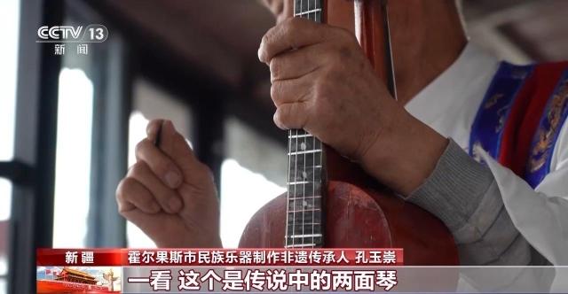 霍尔果斯市民族乐器制作非遗传承人 孔玉崇:270年以前,我们的老一辈人就是守边疆,一个在这里的年轻人,也是爱好音乐,他弹冬不拉,一种想法出来了,这个两面弹不行吗?锡伯族人以前喝水都是用葫芦,他把葫芦两面切掉,很简易的一个双面琴弄出来了。
