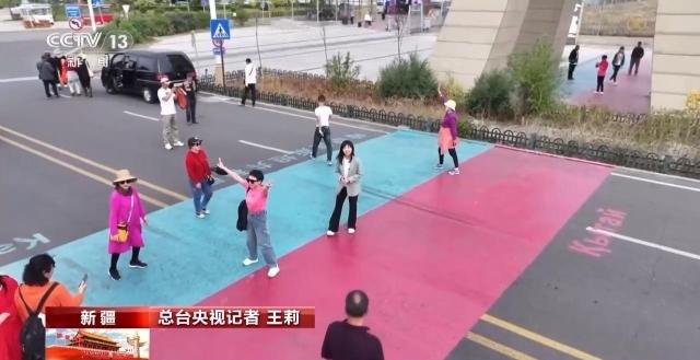 总台央视记者 王莉:进入合作中心,中哈连接通道处的“一步跨两国”,绝对是游客的打卡首选地。红色和蓝色交界的地方,就是国界线了,线的一侧红色区域代表中国,蓝色区域代表哈萨克斯坦。前一秒还在中国,只要一脚迈过分界线,就能一秒“出国”,来到哈萨克斯坦。