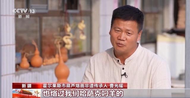 霍尔果斯市葫芦烙画非遗传承人 曹光耀:特别喜欢烙我们新疆的特色,独特之处就是说烫画、烙画、火笔画它能显出一种自然的美,它还有古色古香的古韵,特别接地气。作为烙画非遗传承人,我们必须要把好的文化传承下去。