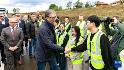 10月4日,在塞尔维亚中部城市上米拉诺瓦茨,塞尔维亚总统武契奇(中)在出席中企承建的绕城公路通车仪式时与项目建设者握手。新华社发(王韡摄)