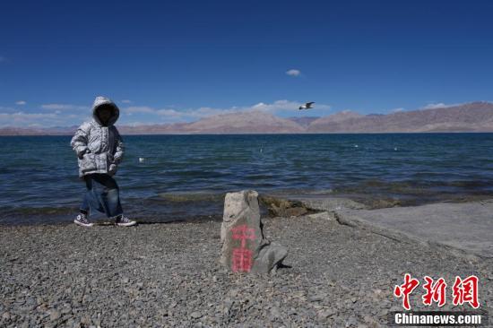 10月4日,一名小游客经过班公湖畔的“中国”石碑。