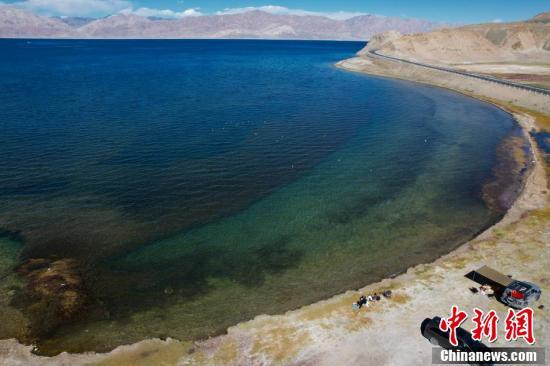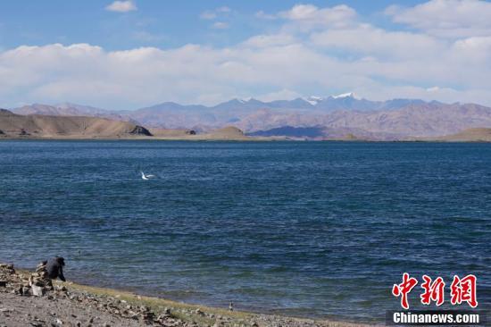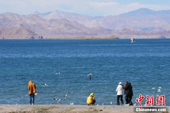 10月4日,游客在班公湖畔游玩。“十一”国庆假期,西藏日土县班公湖吸引不少游客观光游览。