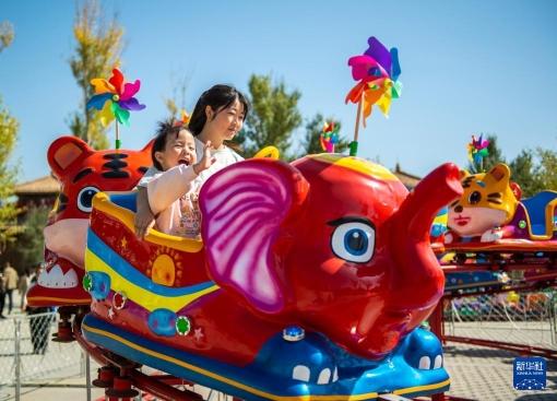 10月4日,游客在位于甘肃省酒泉市的金塔胡杨林景区体验游乐设施。新华社发(高宏善 摄)