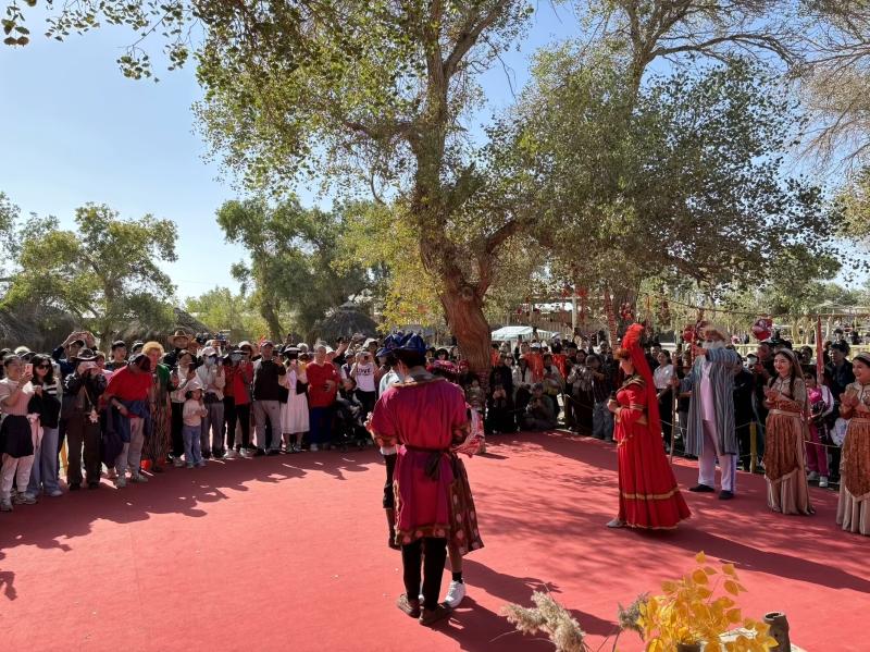 国庆期间,游客在观看尉犁县罗布人村寨景区民俗表演。 罗布人村寨景区供图