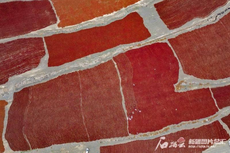 10月3日,种植户在沙湾市安集海镇万亩天然晒场翻晒辣椒(无人机摄)。