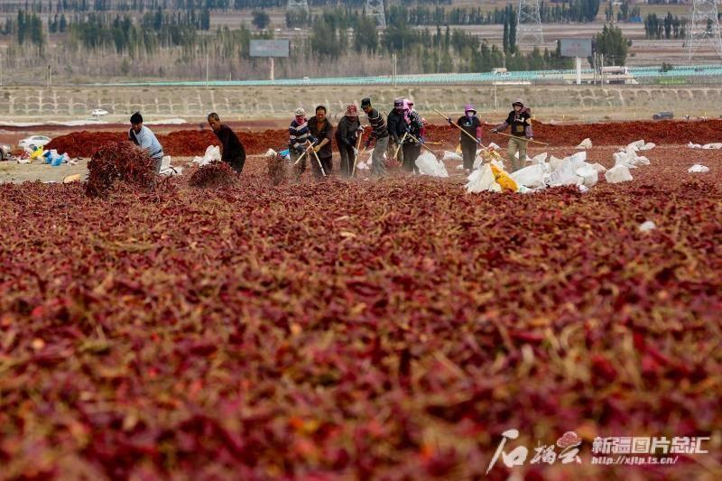 10月3日,种植户在沙湾市安集海镇万亩天然晒场翻晒辣椒。