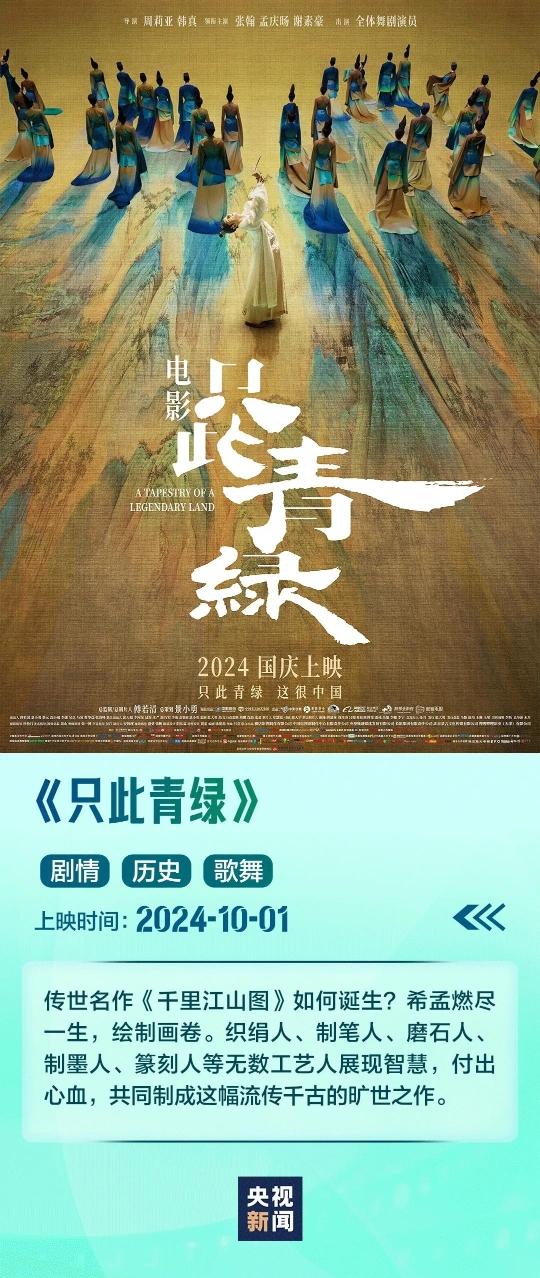 值得一提的是,改编自同名舞剧,由舞台原班编、导、演阵容与电影人合作的电影《只此青绿》上映以来,收获众多好评。从舞台到银幕,电影《只此青绿》以更沉浸的视角、更丰富的想象,为观众展现了传世名画《千里江山图》背后的传统文化之美。