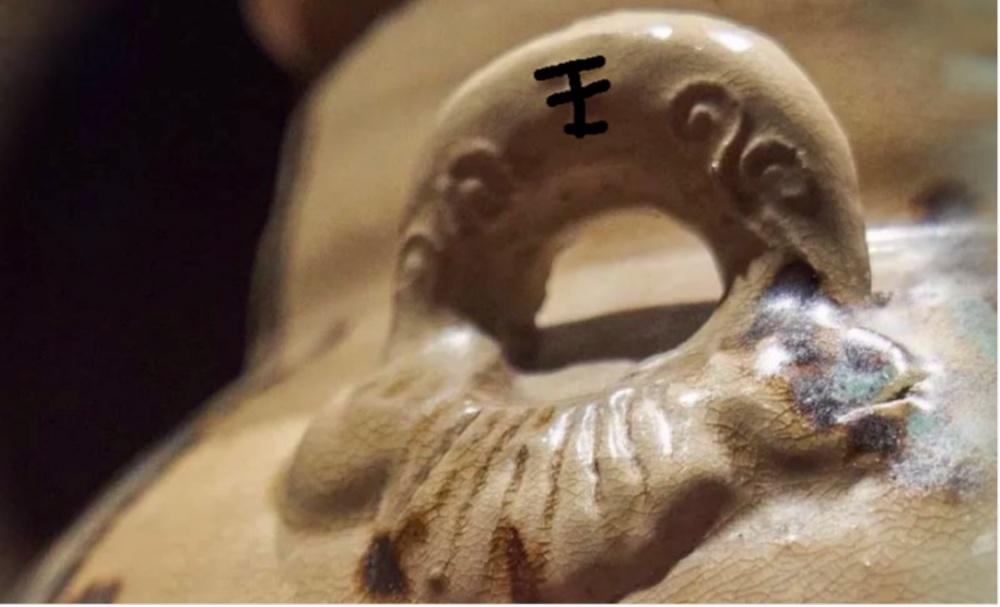 青釉褐绿点彩云纹双耳罐的罐身印有“王”的字样。图片来源:扬州日报社