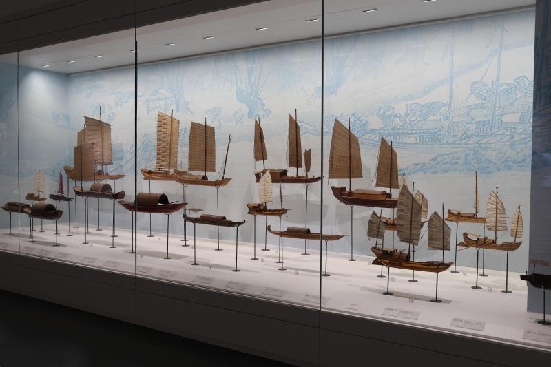 馆内陈列着各种舟船模型、造船航海技术示例、海外民俗器物和外销陶瓷器。透过展窗,千年前的中国与世界各国不同文明交流互鉴、互融共生的场景仿佛再现眼前——海面上,一艘艘满载瓷器、丝绸、茶叶的福船扬帆远航,同时远道而来装满异域珍宝的番舶缓缓入港。码头边,船舶桅杆林立,货物堆积如山,不同肤色、不同国度的商贾、水手比肩接踵。