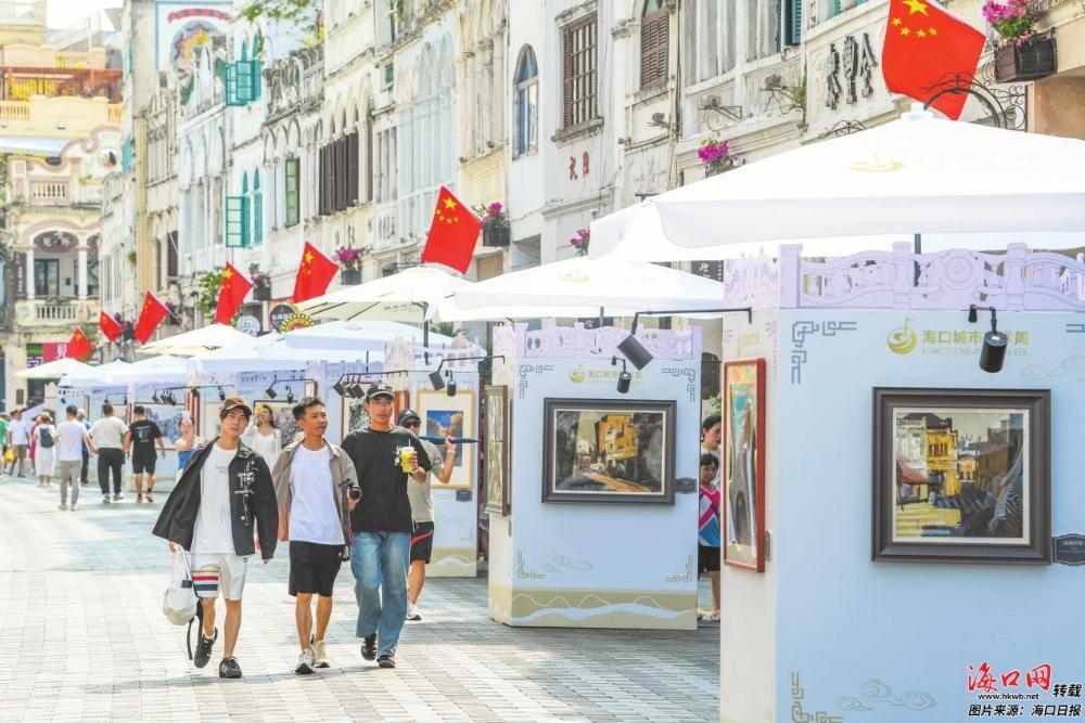 10月1日,在海口骑楼老街,“国韵悠长·遇见骑楼”全国名家写生作品邀请展吸引市民游客前来观赏。记者 康登淋 摄