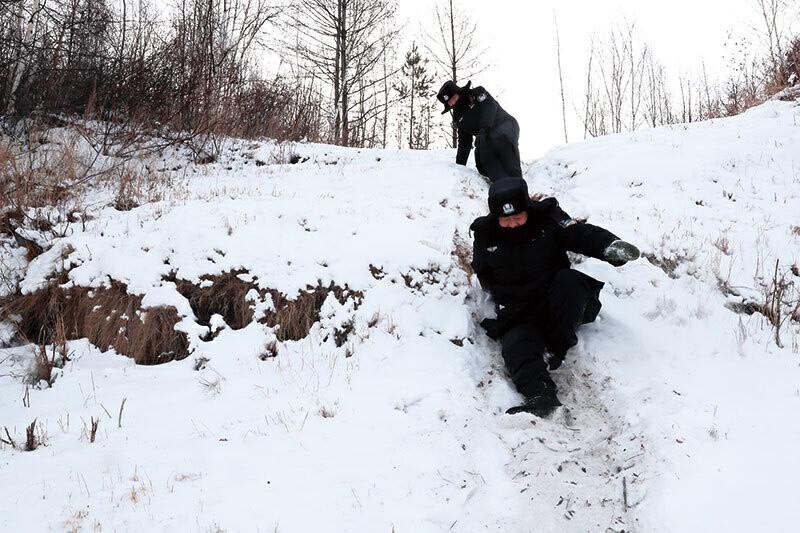 2023年冬季的一天上午,副所长徐克宁带领3位民警前往中俄边境137号界碑进行巡边踏查,之后还将前往黑龙江上清理违规捕鱼的渔网。驱车15分钟,车不能开了,大家只能下车徒步前往界碑。走在被积雪覆盖的小道上,大家深一脚浅一脚,不仅要注意脚下,还要小心头顶被大雪压倒的树木。来到陡坡下,看着被积雪覆盖的陡坡,民警手脚并用,艰难地往上爬。陡坡并不好爬,一脚蹬不住,就滑了下来。
