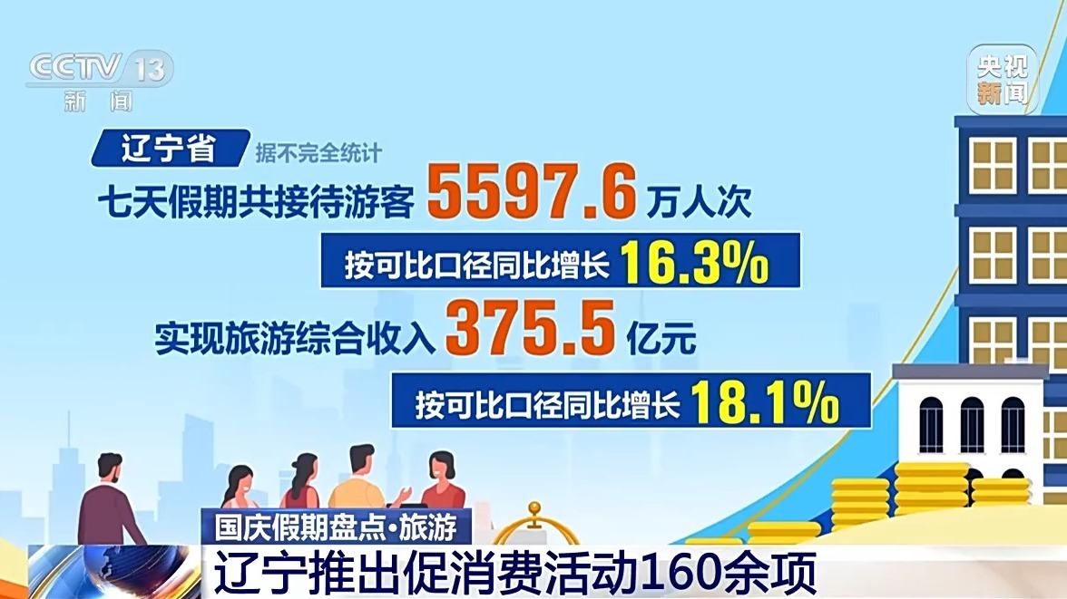 辽宁省据不完全统计,七天假期共接待游客5597.6万人次,按可比口径同比增长16.3%,实现旅游综合收入375.5亿元,按可比口径同比增长18.1%。假期里辽宁省推出促消费活动160余项,全省各地举办文化艺术、群众文化、非遗、文博等各类活动600余场,通过线上线下联动的方式,丰富人们假日文化生活。