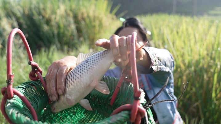而侗族人民的智慧远不止于此,他们巧妙地利用当地自然环境,孕育出独特的“稻鱼鸭”共生稻作文化。从江县往洞镇增冲种植养殖专业合作社负责人石刚勇说,“种植一季稻、放养一批鱼、饲养一批鸭,稻鱼鸭系统能够和谐共存,是因为打了时间差。种稻的时候放鱼苗,鱼苗能清理土壤,让土壤疏松。等到农历的三月下旬或四月上旬,再放入鸭苗。此时的秧苗已经长成,刚出生不久的鸭苗不会损坏秧苗,鸭子吃田里的虫子,它们的粪便喂鱼,鱼粪又滋养稻谷,这就形成了一个完美的生态循环。”