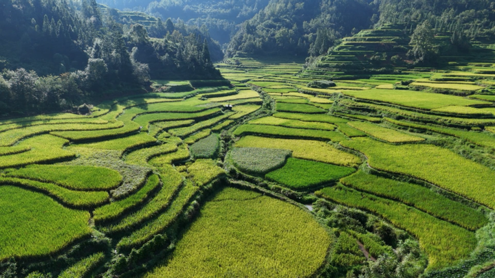 增冲侗寨位于河谷开阔地带,有着六百余年的建寨历史,周围山林环绕。为了将稀缺的土地资源用到极致,先民们向山林问道,从动植物习性中获取灵感,靠着古老的农耕器具和耕牛,在这片土地上开垦出层层梯田。而后,借助自然的山泉水进行灌溉,于是,一片独特而又美丽的梯田景观应运而生,这里也成为了如今名副其实的“鱼米之乡”。