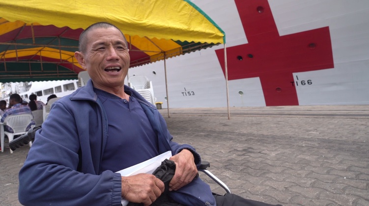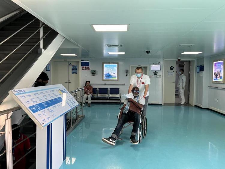 一家中资公司的中国船员常洪彬在捕鱼作业时,不慎被渔网钢缆击中右腿,导致无法活动且疼痛剧烈。“和平方舟”号医院船医护人员立即启动急救预案,对常洪彬做了详细检查。