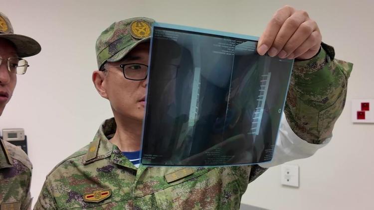 “和平方舟”号医院船骨科医生陈宜:综合患者病史、查体及X线检查,我们判断伤员为右腿胫腓骨中段骨折。综合他的身体条件和伤情,我们几位骨科医生研究后决定为伤员实施“骨折手法复位+石膏固定术”。