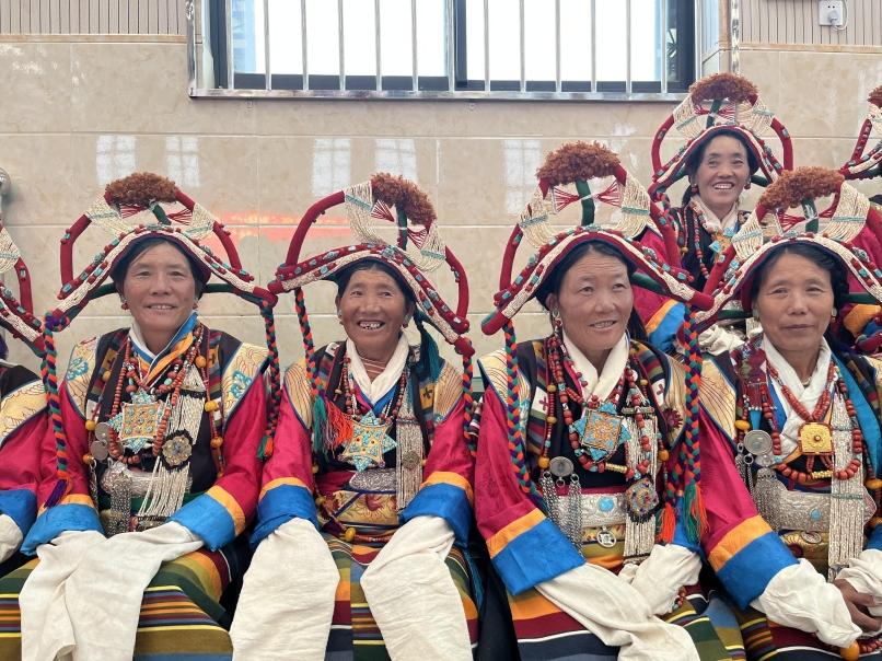 现在的谐钦队共有67名成员,30岁以下的年轻人有8人,云丹卓玛老阿妈也如愿收了一名“关门弟子”曲桑。她是谐钦队的现任队长,从事谐钦已有20多年,后被评为萨尔谐钦市级非遗传承人。“我们力求在保留萨尔谐钦原汁原味的基础上,在舞步与服饰上有所改进,更好地展现当代农牧民的风采。”她说。