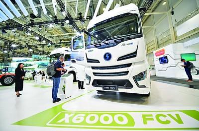 9月16日,在德国汉诺威国际交通运输博览会媒体预展上,参观者在陕汽控股展区了解一款氢燃料电池牵引车。新华社发