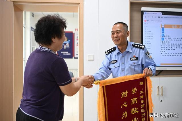 在天津市东丽区万新街道万隆社区,民警平亚楠(右)接到了群众送来的一面锦旗(9月29日摄)。本组图片均由新华社记者 孙凡越 摄
