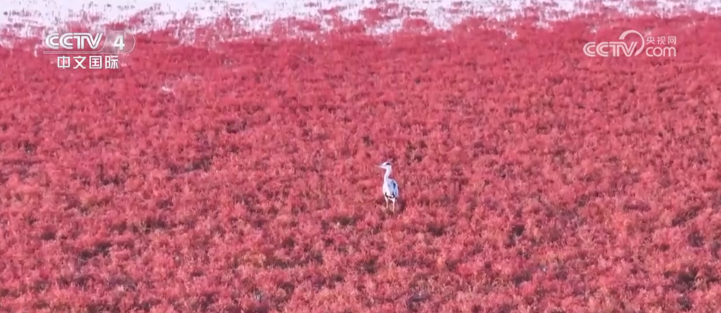 在山东威海南海新区,滩涂霞染,成片的“红海滩”迎来最佳观赏期。“红海滩”是由一株株翅碱蓬堆积而成,翅碱蓬是生长在滩涂上的盐碱植物,为一年生草本。每年深秋时节,这里的大片翅碱蓬就开始泛红,形成浪漫美丽的“红海滩”景观。苍鹭等鸟类在“红海滩”上或停停走走,或展翅翱翔。在这里,大片的浅海滩涂湿地已形成河、海、草、鸟相依相存的独特生态系统。
