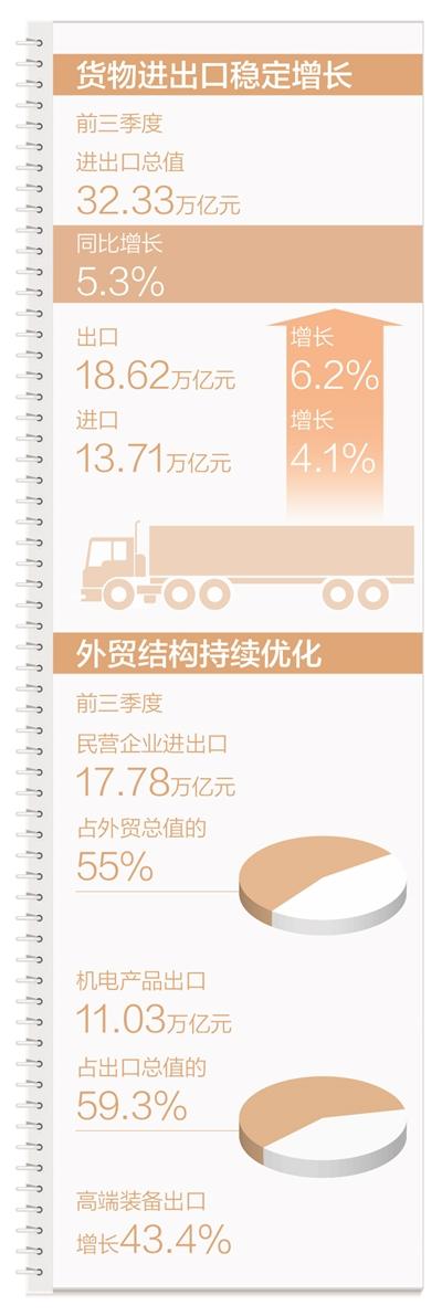 各类经营主体保持活跃。民营企业实现较快增长,前三季度,民营企业进出口17.78万亿元,增长9.4%,占外贸总值的55%,提升了2.1个百分点;外商投资企业进出口9.53万亿元,增长1.1%,连续两个季度增长。
