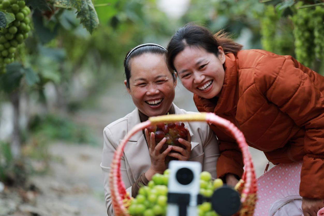 2024年10月6日,果农在贵州省黔西市金碧镇新兰村葡萄园里进行直播销售。来源:人民图片