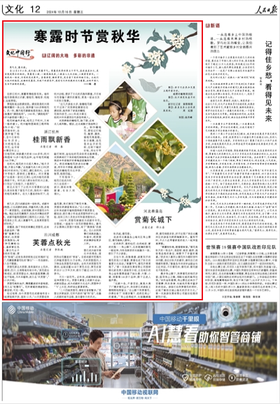 自10月8日以来,我们进入寒露节气。寒露是秋季的第五个节气,昼夜温差加大,是凉爽到寒冷的转折。寒露有三候:一候鸿雁来宾,二候雀入大水为蛤,三候菊有黄华。一场秋雨一场凉,仍有秋花次第开。登高游览、踏秋赏花,是沿袭下来的传统习俗。让我们从杭州的桂花、成都的芙蓉花、长城下的菊花中,感受它们所承载的文化意象,品味中国人生活中独特的浪漫。