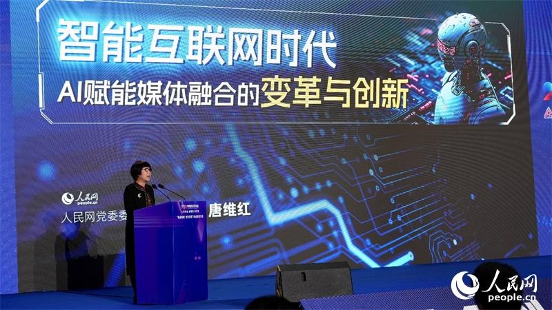 人民网监事会主席、研究院院长唐维红发表题为《智能互联网时代AI赋能媒体融合的变革与创新》的主题报告。人民网记者 吴茜薇摄