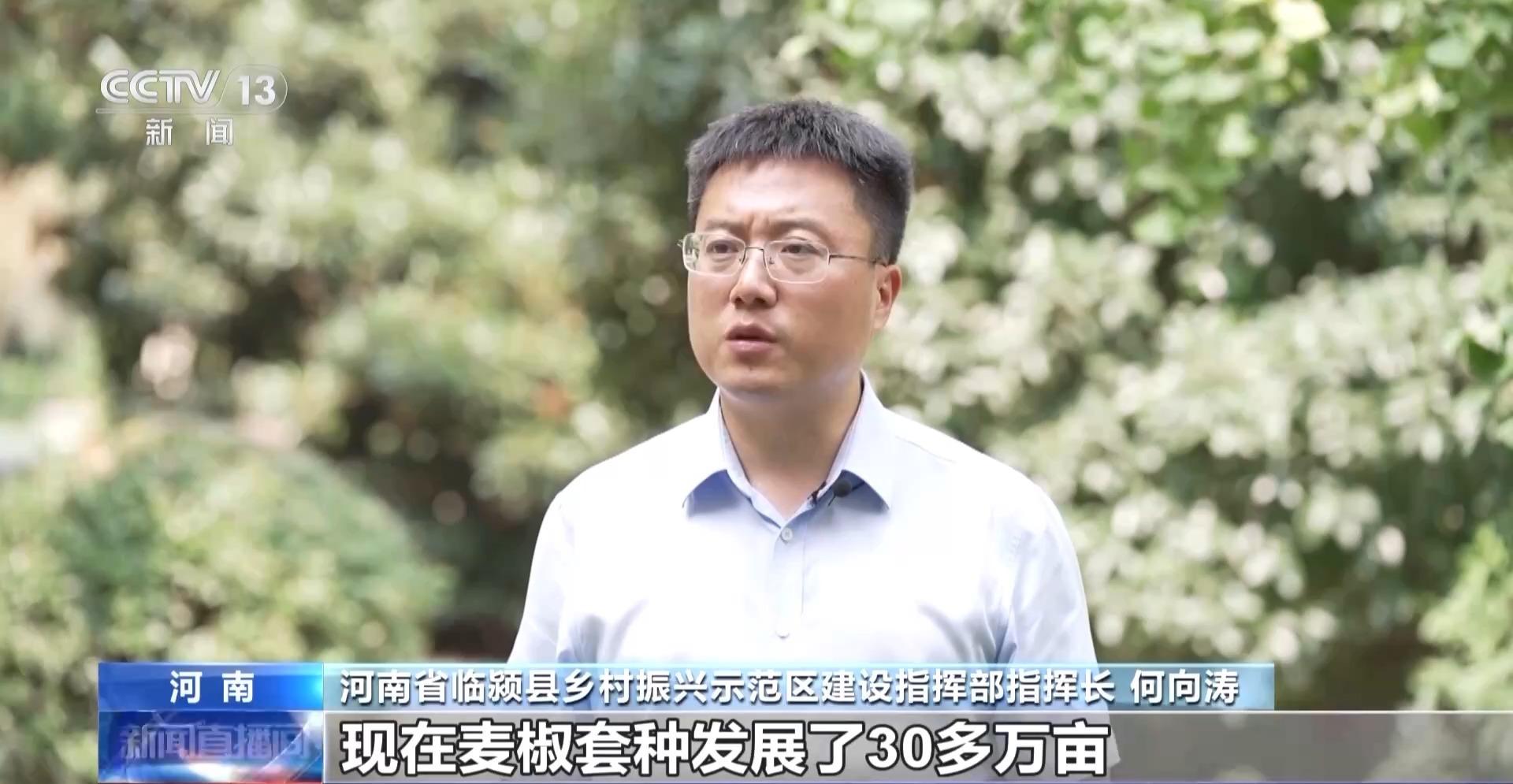 河南省临颍县乡村振兴示范区建设指挥部指挥长 何向涛:现在麦椒套种发展了30多万亩,普通农户一年一季小麦一季辣椒,亩均收益能够达到6000多元,比传统的种植,亩均要增收3000元以上。