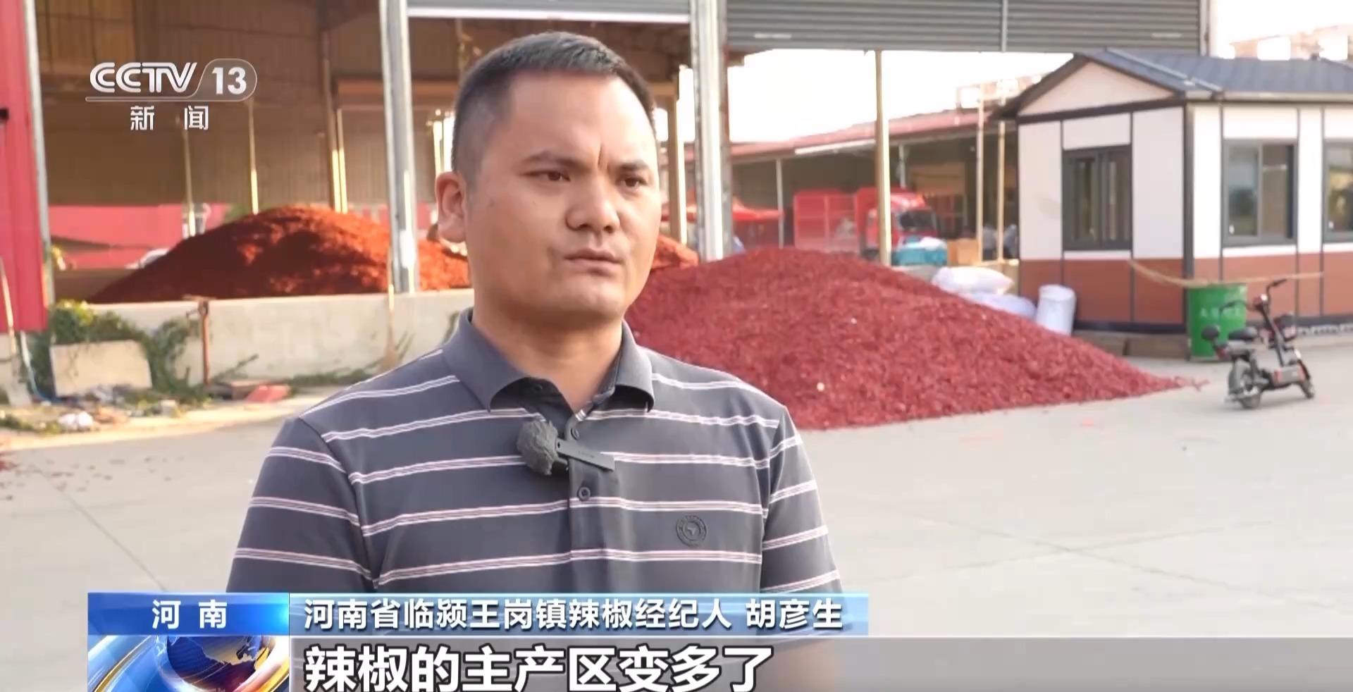 河南省临颍县王岗镇辣椒经纪人 胡彦生:辣椒的主产区变多了,也涌现出更多的品种,不单单要卖自己的辣椒,还要把外面的辣椒引过来,经过我们临颍的加工之后再卖出去,买全国卖全国这个模式就出现了。
