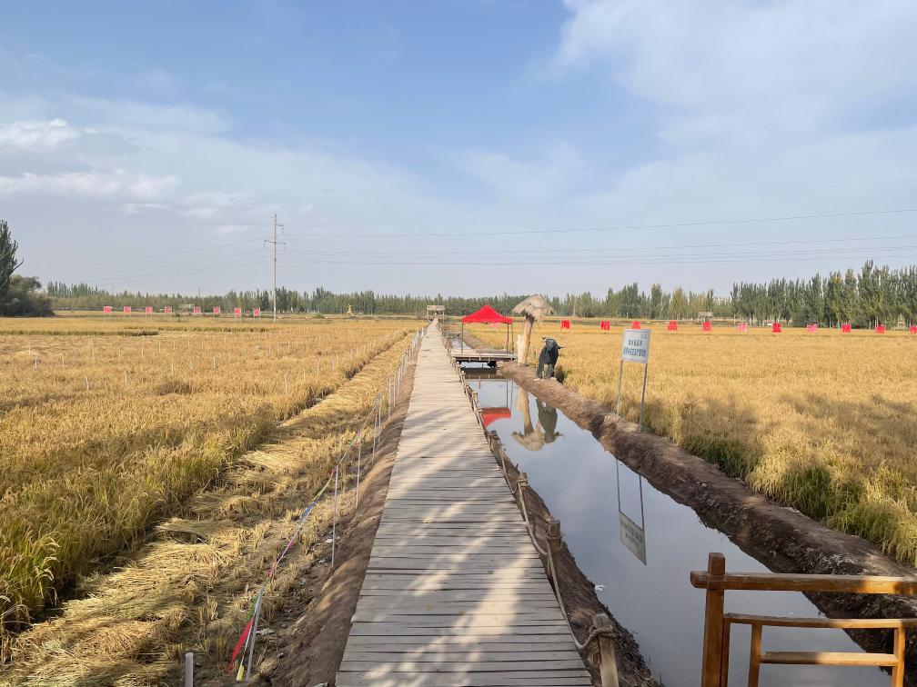 这是10月16日拍摄的喀什帕哈太克里乡水稻基地。(新华社记者彭茜摄)