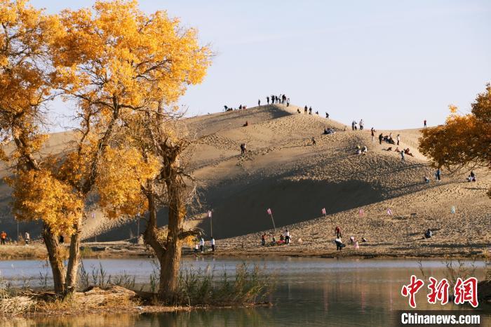 中新网新疆尉犁10月20日电 时值晚秋,位于塔克拉玛干沙漠边缘的罗布人村寨景区内,金色的胡杨装点着景区,络绎不绝的游客或爬上连绵起伏的沙丘,感受长河落日圆的大漠风情,或骑上骆驼,和驼队一起穿越沙漠,或坐上沙漠越野车,体验在无垠沙海中冲浪的惊险与刺激……