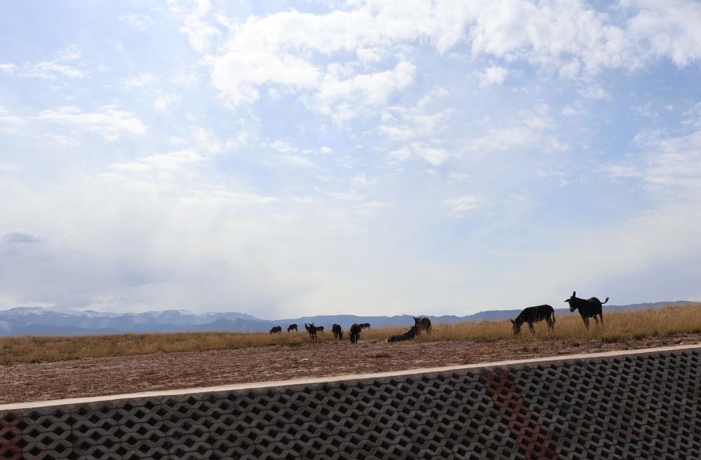 16日,焉支山下,几头毛驴正悠闲地觅食。新华社记者 刘雅萱 摄