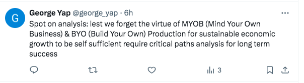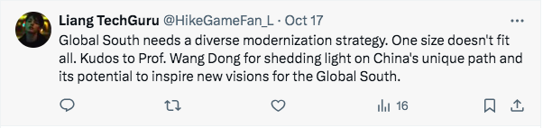 网友@George Yap评论:“真是一针见血!别忘了‘做好自己的事’(Mind Your Own Business)和‘靠自己’(Build Your Own)的好处。”网友 @Liang TechGuru留言:“‘全球南方’需要多样化的现代化战略,不能一刀切。感谢王栋教授为我们揭示了中国的独特道路及其为‘全球南方’国家带来新愿景的潜力。”