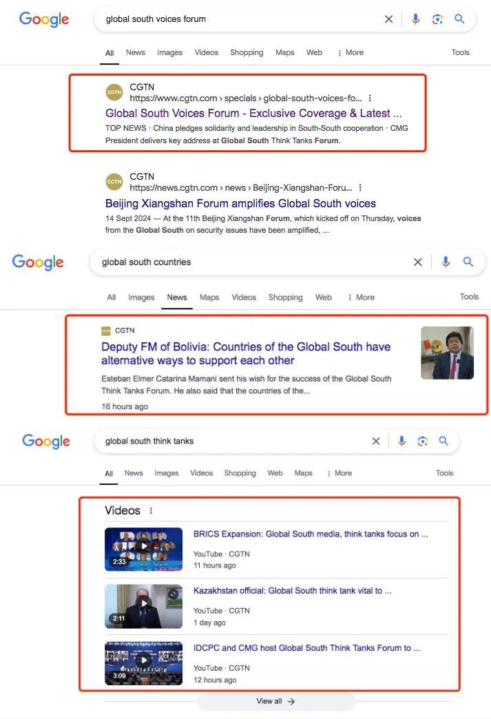 论坛期间,总台CGTN官网及客户端同步推出《来自“全球南方”的声音》专题页面,紧跟论坛动态及亮点,展现“全球南方”携手共进、共谋发展强音。在谷歌搜索“Global South Voices Forum”“Global South Think Tanks”“Global South Countries”等关键词,CGTN论坛报道均为新闻页第一位。
