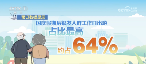 预订数据显示,国庆假期后银发人群工作日出游占比最高,约占64%,明显高于其他年龄段人群。中老年旅客机票预订量明显增长,55岁以上的旅客占比在10%左右。