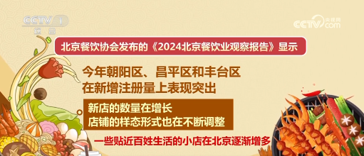 北京餐饮协会发布的《2024北京餐饮业观察报告》显示,今年朝阳区、昌平区和丰台区在新增注册量上表现突出,新店的数量在增长,店铺的样态形式也在不断调整,一些贴近百姓生活的小店在北京逐渐增多。