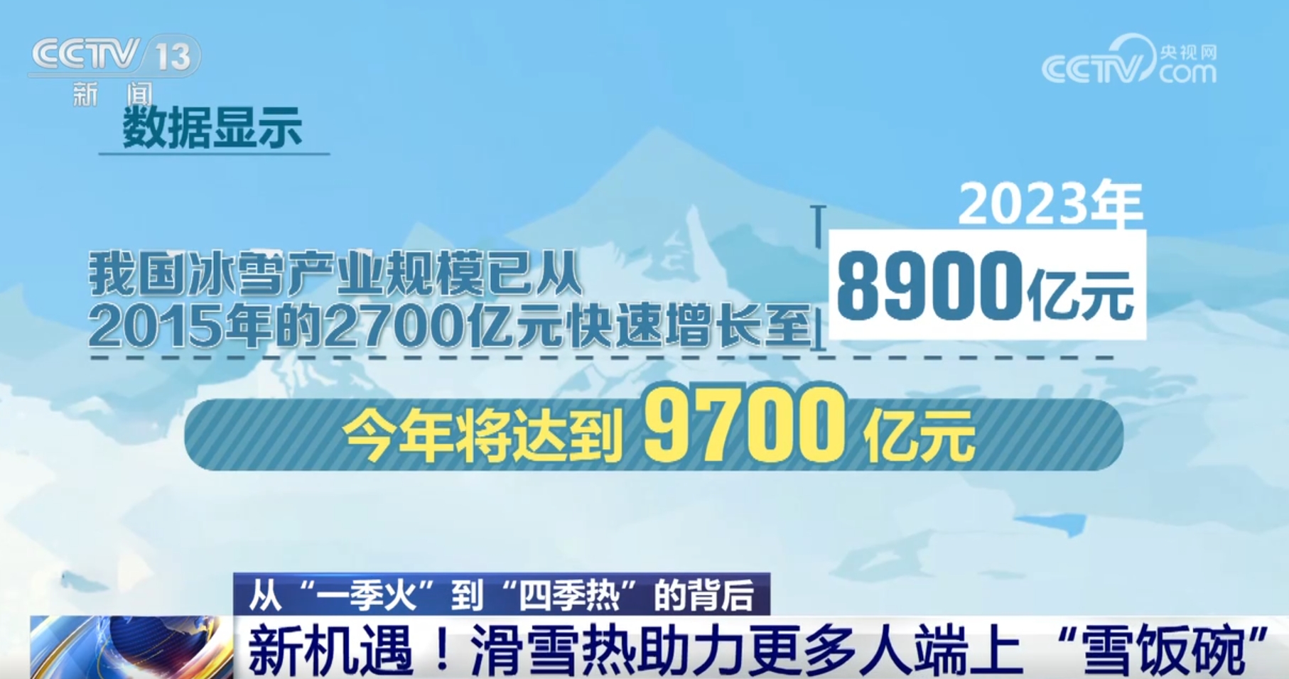 数据显示,我国冰雪产业规模已从2015年的2700亿元快速增长至2023年的8900亿元,今年将达到9700亿元。在大型冰雪赛事的推动下,我国冰雪产业将进入持续高速增长阶段,呈现出市场规模不断扩大、消费需求更加多样、产业链不断完善等发展新态势。