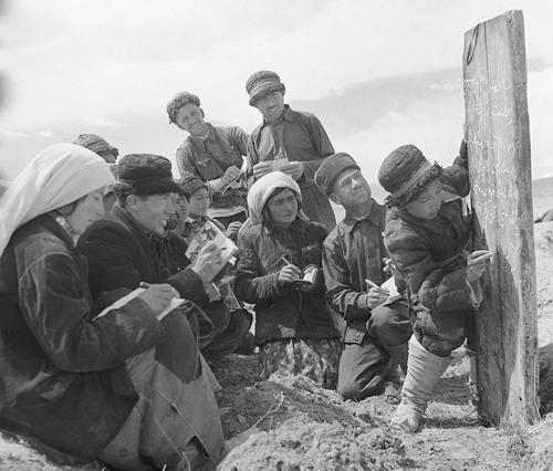 图为1960年,新疆塔什库尔干塔吉克自治县慕士塔格人民公社二大队的社员在小学生的帮助下在田间学习文化。 新华社记者武纯展摄(资料照片)