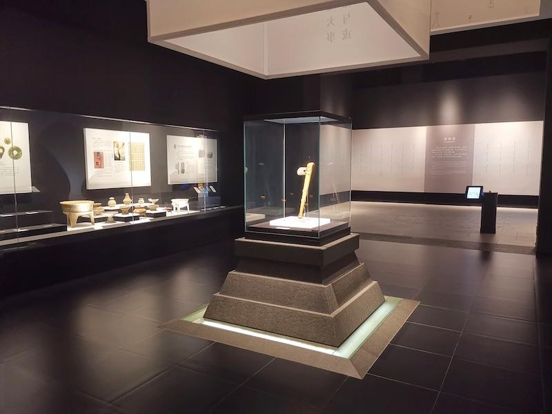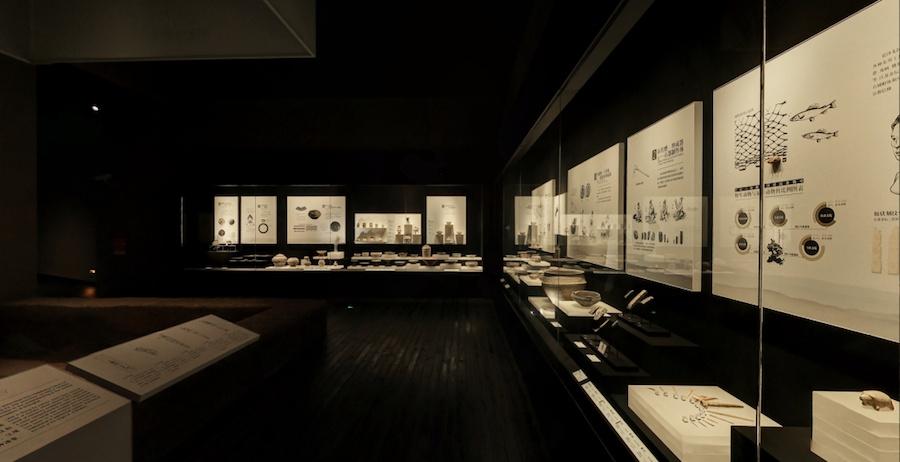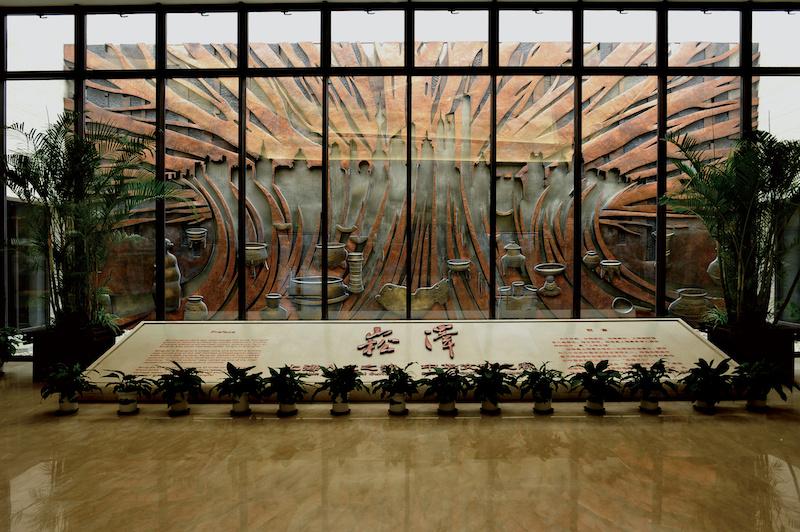 崧泽遗址博物馆从外观上想要打造的是古老村落的缩影,欲将小桥、流水、村落和庭院融入建筑之中。展厅入口处,仿造的是当年遗址发掘时的地层剖面,剖面上浮现着影影绰绰的投影,是仿造考古遗存中一些陶器、玉器上的刻划符号,同时还有一些陶器和贝壳遗存。