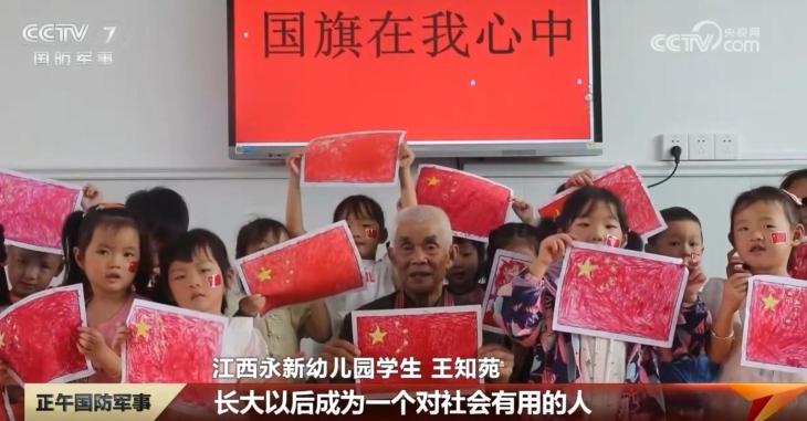 在江西永新,抗美援朝老兵走进当地幼儿园,给孩子们讲述那段波澜壮阔的历史,并与孩子们共同绘制国旗。