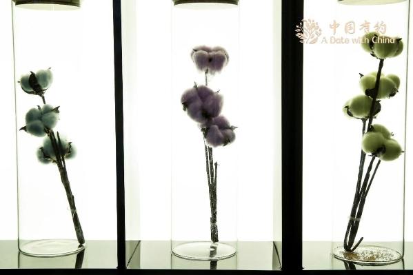 展示厅内的蓝色、紫色、黄色棉花。