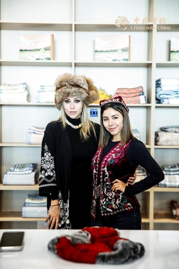 博主们在试穿新疆民族服饰。