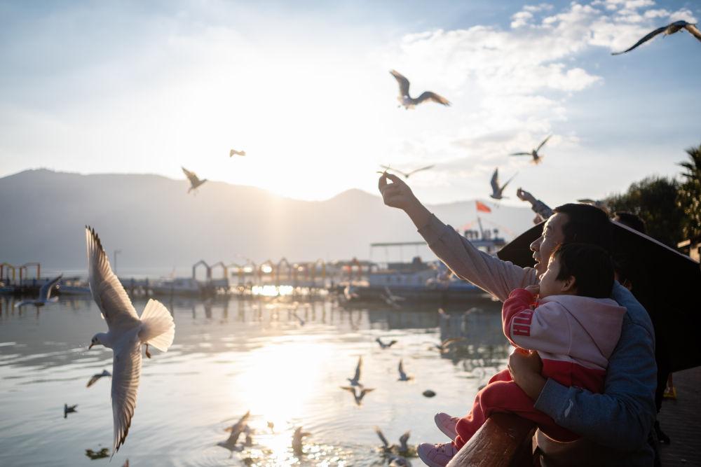 市民在云南滇池畔投喂红嘴鸥(2022年10月20日摄)。新华社记者 王冠森 摄