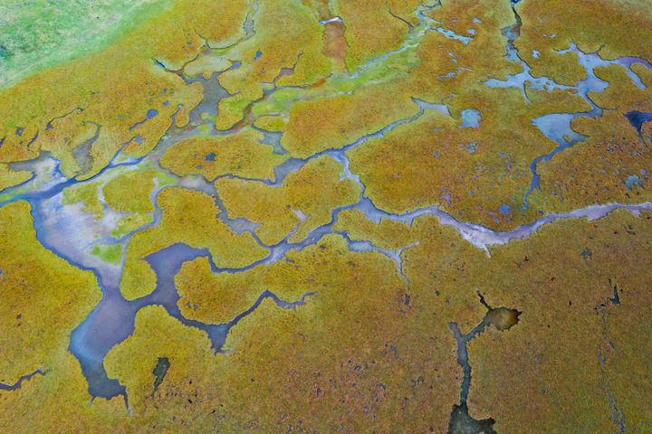 这是2022年9月17日在甘肃省甘南藏族自治州玛曲县拍摄的黄河上游重要水源涵养地阿万仓湿地内的一处沼泽景观。占地562万亩的玛曲湿地是世界上保存最完整的湿地之一,被誉为“黄河之肾”(无人机照片)。新华社记者 郎兵兵 摄