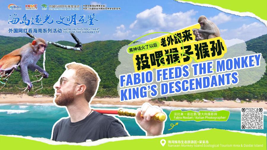 南海网10月28日消息 今年暑期,国产首个3A游戏大作《黑神话:悟空》火爆全网,给了游戏玩家们一个大惊喜。近日,在海南陵水南湾猴岛生态旅游区,来自意大利的摄影师法比奥·诺达里(Fabio Nodari)手持金箍棒,化身“悟空”在这见到了“大师兄”的伙伴们,在猴岛体验游戏以外的热带风情和浪漫。