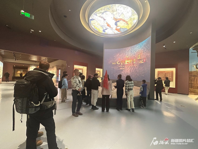 外国自媒体创作者们在参观七个星佛寺遗址博物馆。石榴云/新疆日报记者 张小宓摄