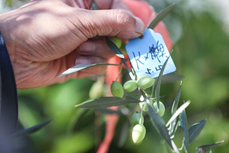 10月28日,在位于甘肃省陇南市武都区的陇南市经济林研究院油橄榄研究所大堡油橄榄试验园,陇南市经济林研究院油橄榄研究所高级工程师王贵德观察一株由奇迹油橄榄(原产地希腊)和佛奥油橄榄(原产地意大利)杂交的种子的生长情况。