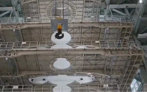 平台上方,已经完成吊装的长二F火箭被一层层工作平台环抱着。头后仰90度,一座通体刷着黄色油漆的吊车进入视线。这座吊车高达70多米,长二F火箭从“平躺着”进来到完成“站立”,它的功劳最大。火箭“平躺着”卸车之后,要在这里进行吊装对接,让“躺着”的火箭立起来。