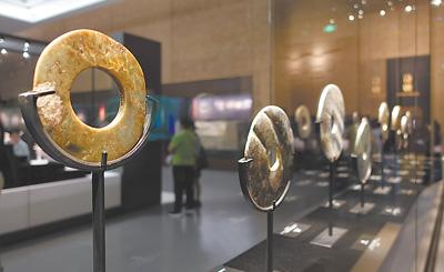 良渚博物院坐落在浙江杭州市余杭区美丽洲公园内,是全面展示良渚文化的考古遗址博物馆。图为良渚遗址出土的玉器。
